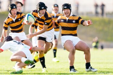 秦選手とハーフ団を組むのは、宮崎悠馬選手。「今日はラックの所で相手からプレッシャーが来ていた。球出しを安定させることに注力した」と話す。次戦は、強敵の石見智翠館が相手。「状況に応じて周りを巧く使い、強敵に勝ちたい。」