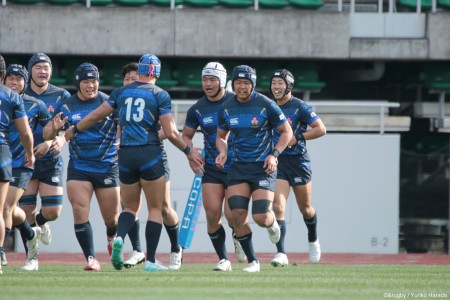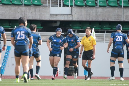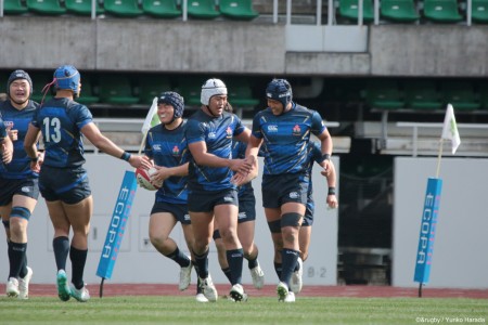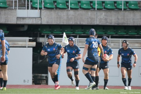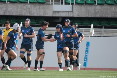 逆サイドへ振れば、7番・大西一平選手、4番・奥平一磨呂選手、2番・長島幸汰選手とFW陣が細かく繋いでトライを取り切る。