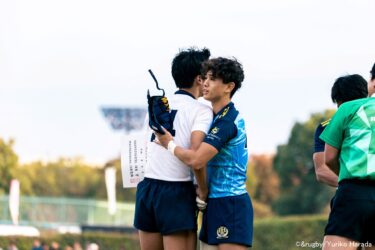 先発15人の中でもう1人の1年生、13番・宮崎和史選手との連携から、1本目は大沢櫂キャプテンが、2本目は25番・重冨益昌選手がトライを決めた。