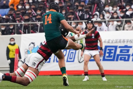 東福岡13番のキャリーをタックルで止めたのは13番・炭竈選手。すぐにサポートが入れば、10番・伊藤利江人選手がボールを奪い取り再び炭竈選手が力強いキャリーで15m程陣地を返した。