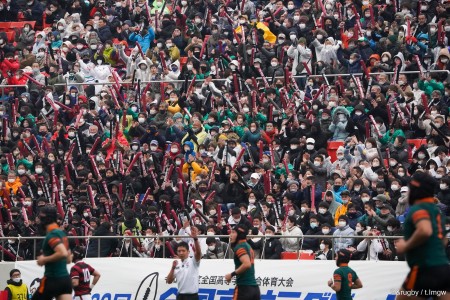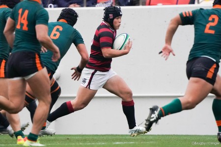 12番・菊川迪選手は、それまで先発していた森田倫太朗選手(3年生)の負傷により先発を託された2年生。先輩たちの「ホートク、タックルしよう!」の声が届くと、相手5番に迷いなくタックルを決め、出足を遅らせた。