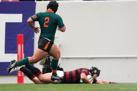 No.8石橋チューカ選手が両手をキレイに伸ばし、キックチャージに成功。ボールを獲得すると、10番・伊藤利江人選手、13番・炭竈柚斗選手と繋がり、そのままインゴールに飛び込んだ。