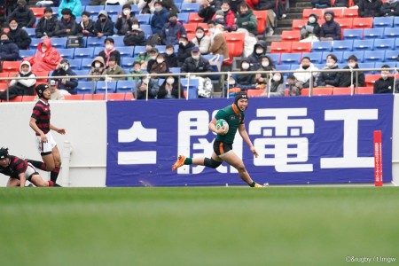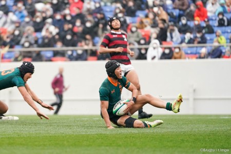 すると相手のノットストレートを誘い、マイボールスクラムから13番・永井選手が左サイドで力強くゲインラインを突破すれば、最後は大外に控えし11番・上嶋選手がトライを取り切った。