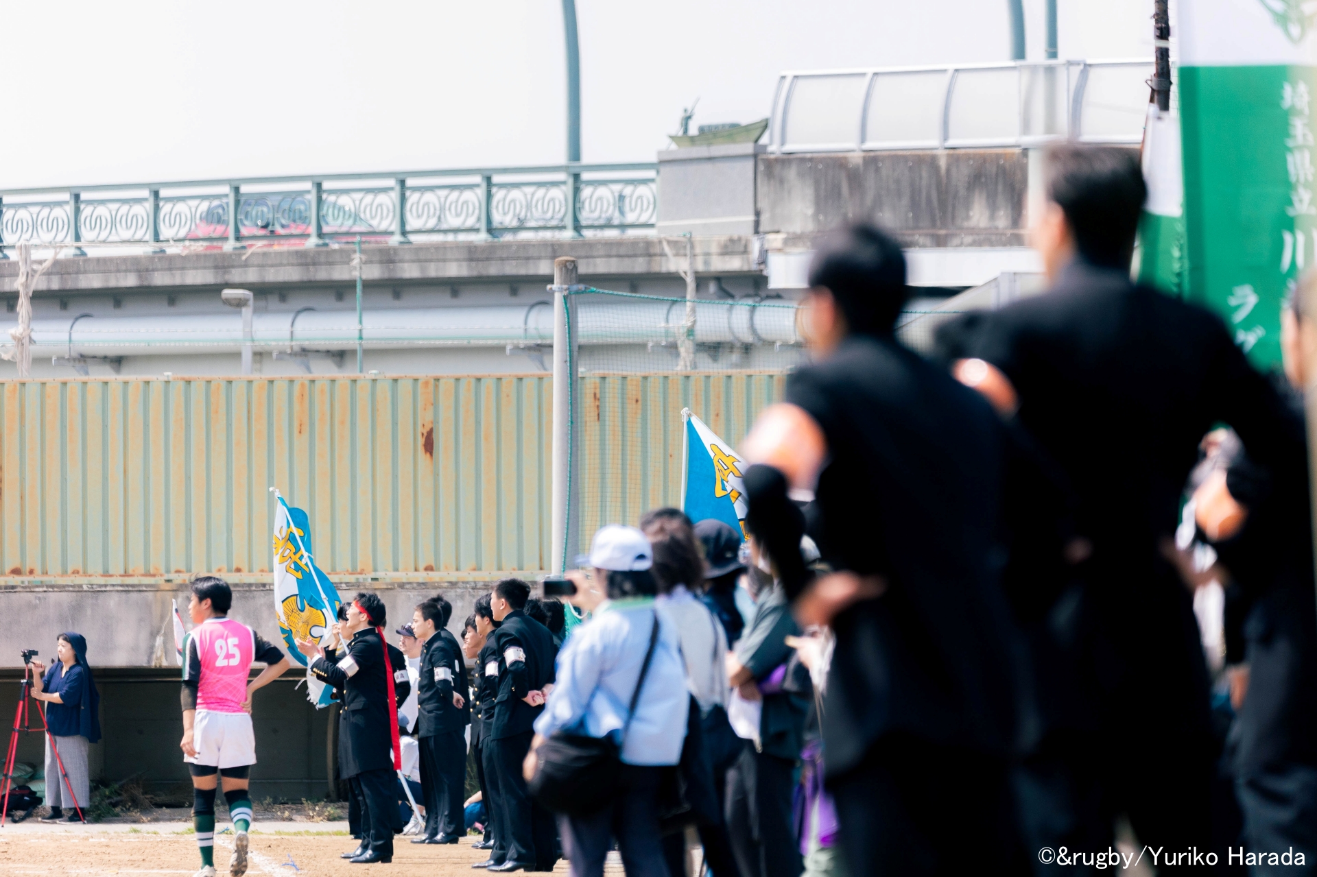 ともに県立高校の男子校。両校の應援團も公式戦では数年ぶりに揃ったという一戦は、長短織り交ぜたキックが多用される中進んだ。