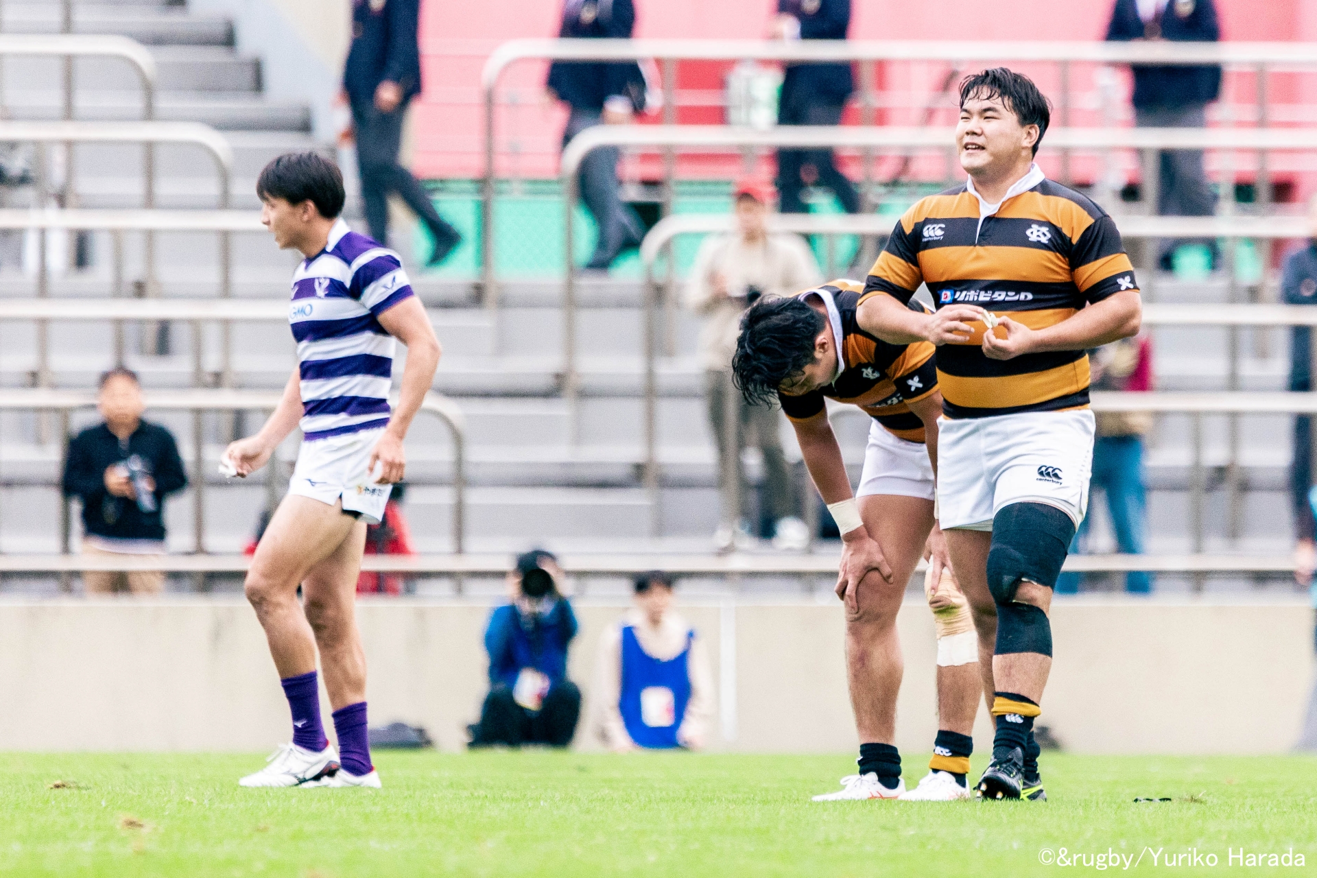 慶應義塾大学がポゼッションを保持し、逆転を狙って最後の攻撃を仕掛ける。後半43分。もはやキックで陣地を取ることはできない。