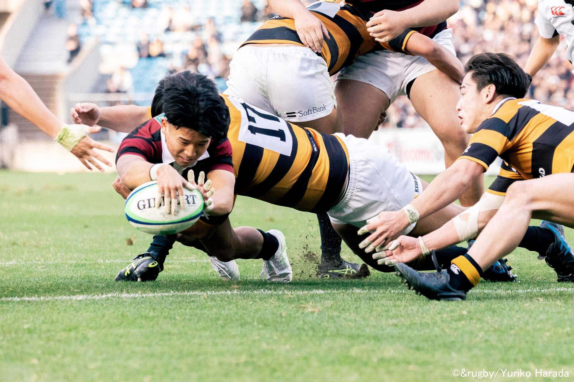 試合が動いたのは後半20分。慶應義塾がラインアウトからモールを押し込み、崩れるも逆サイドまでボールを繋いだところ、最後は23番・石垣慎之介選手がトライ。
