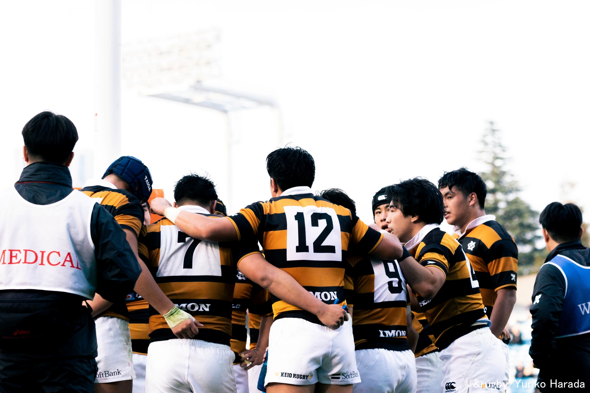 自陣トライゾーンで円陣を組んだ、慶應義塾フィフティーン。今野キャプテンは、迷いのない声を響かせる。