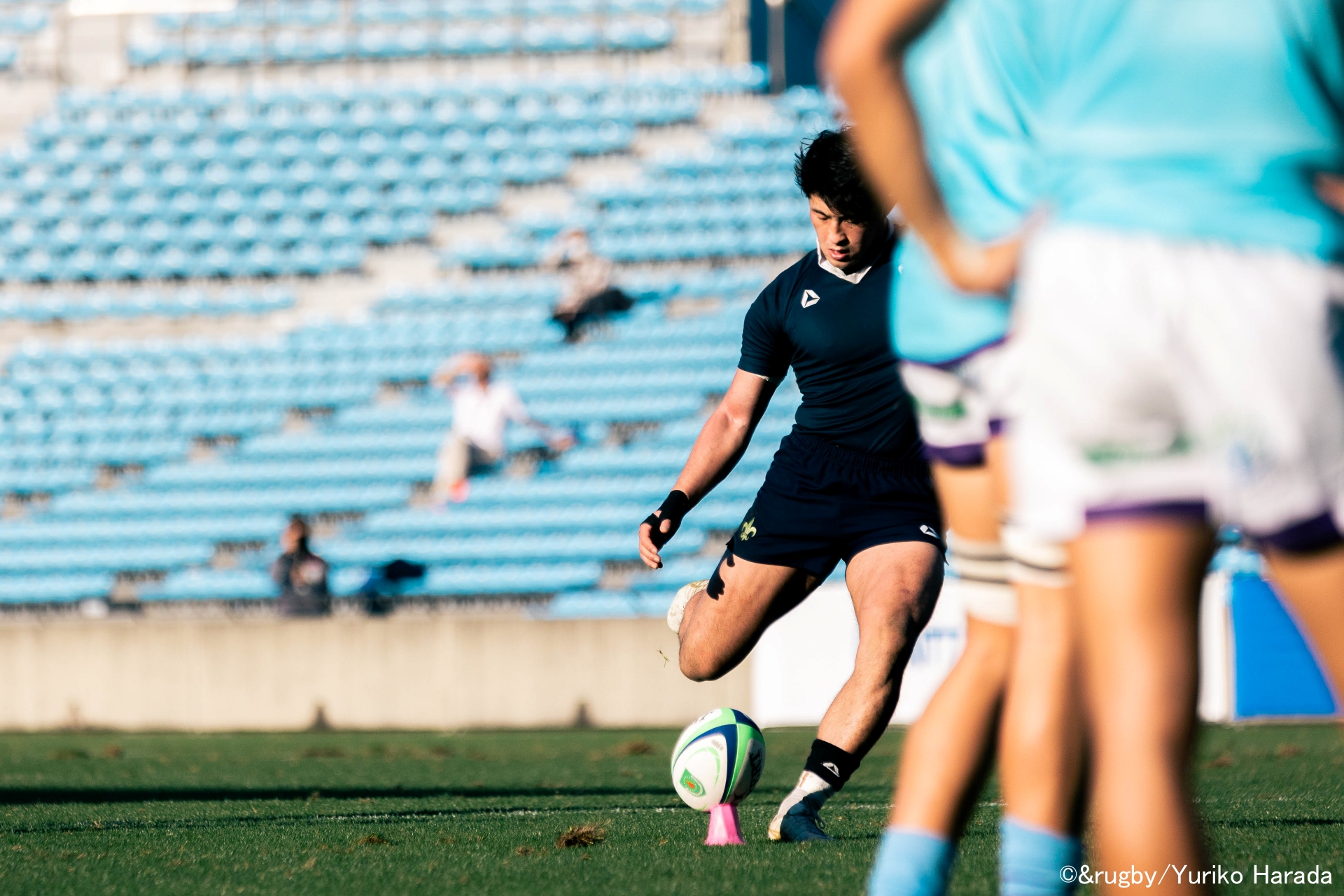 何度もトライゾーンへ迫ったが、グラウンドには至らない。それでも前半37分、中央正面のペナルティから13番・佐藤侃太朗選手がPGを沈め、スコアを14−3とした。