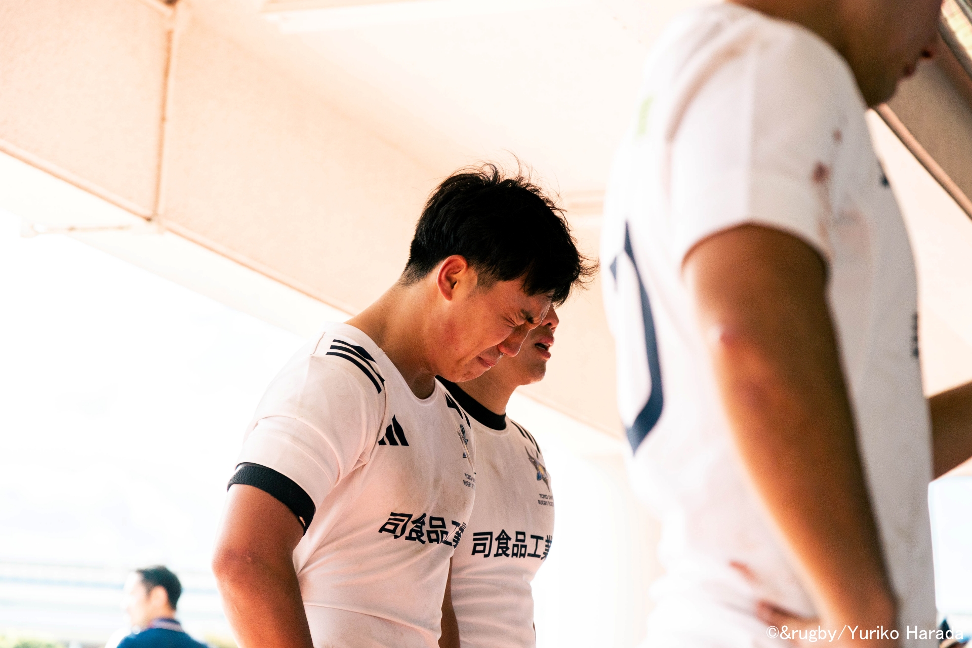 涙に暮れるWTB浅尾至音選手(3年生)。その肩にそっと手を添えたのは、高校の先輩であるCTB天羽進亮選手(4年生)だった。
