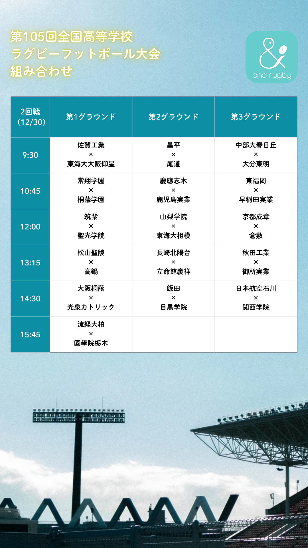 東大阪市花園ラグビー場で行われている第105回全国高等学校ラグビーフットボール大会は、12月28日までに1回戦の全日程を終了した。