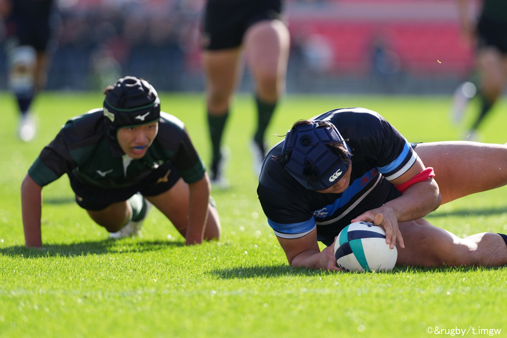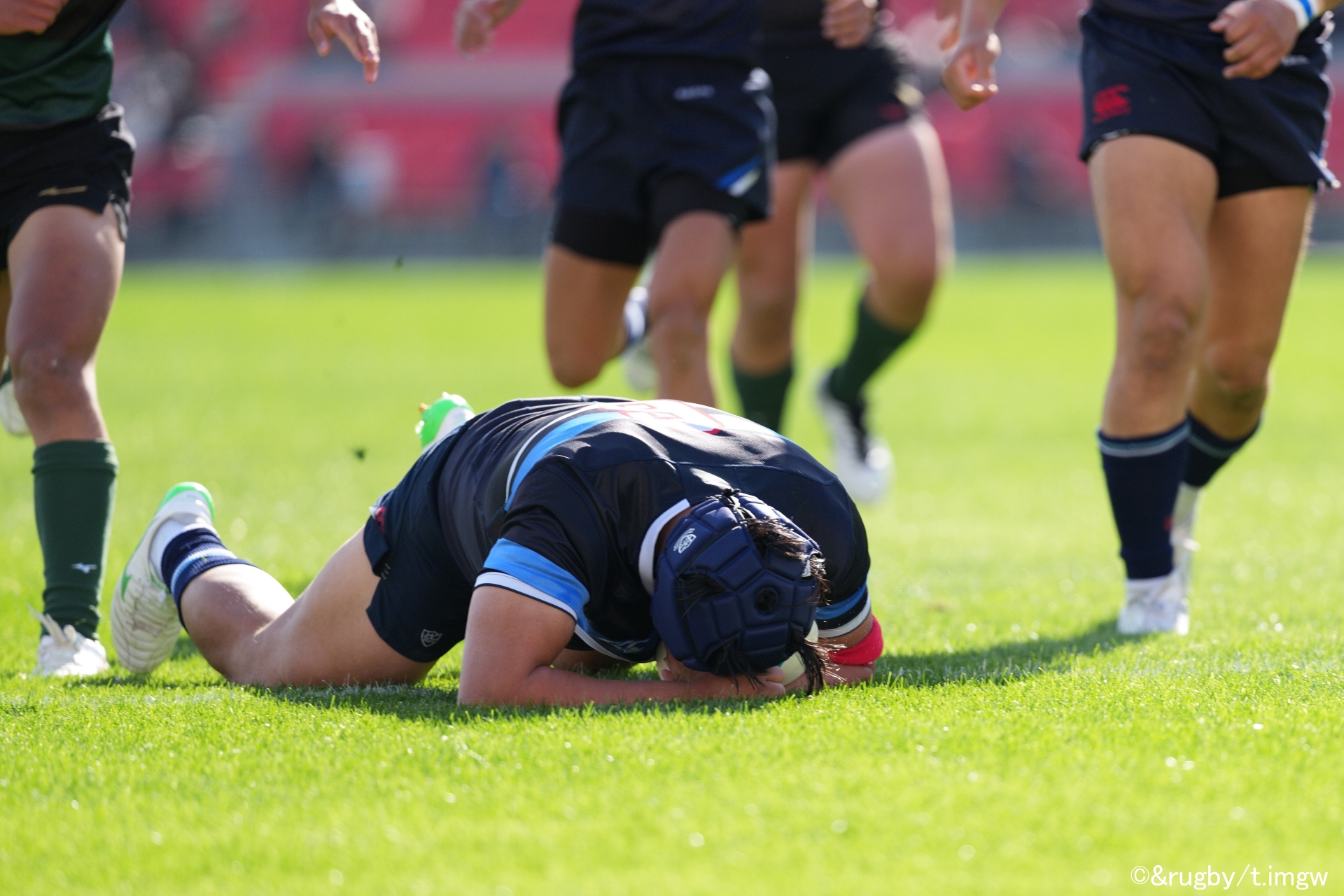 倒れた米谷選手が、もう一度ボールを拾い上げ、しっかりと抱え込んでグラウンディング。