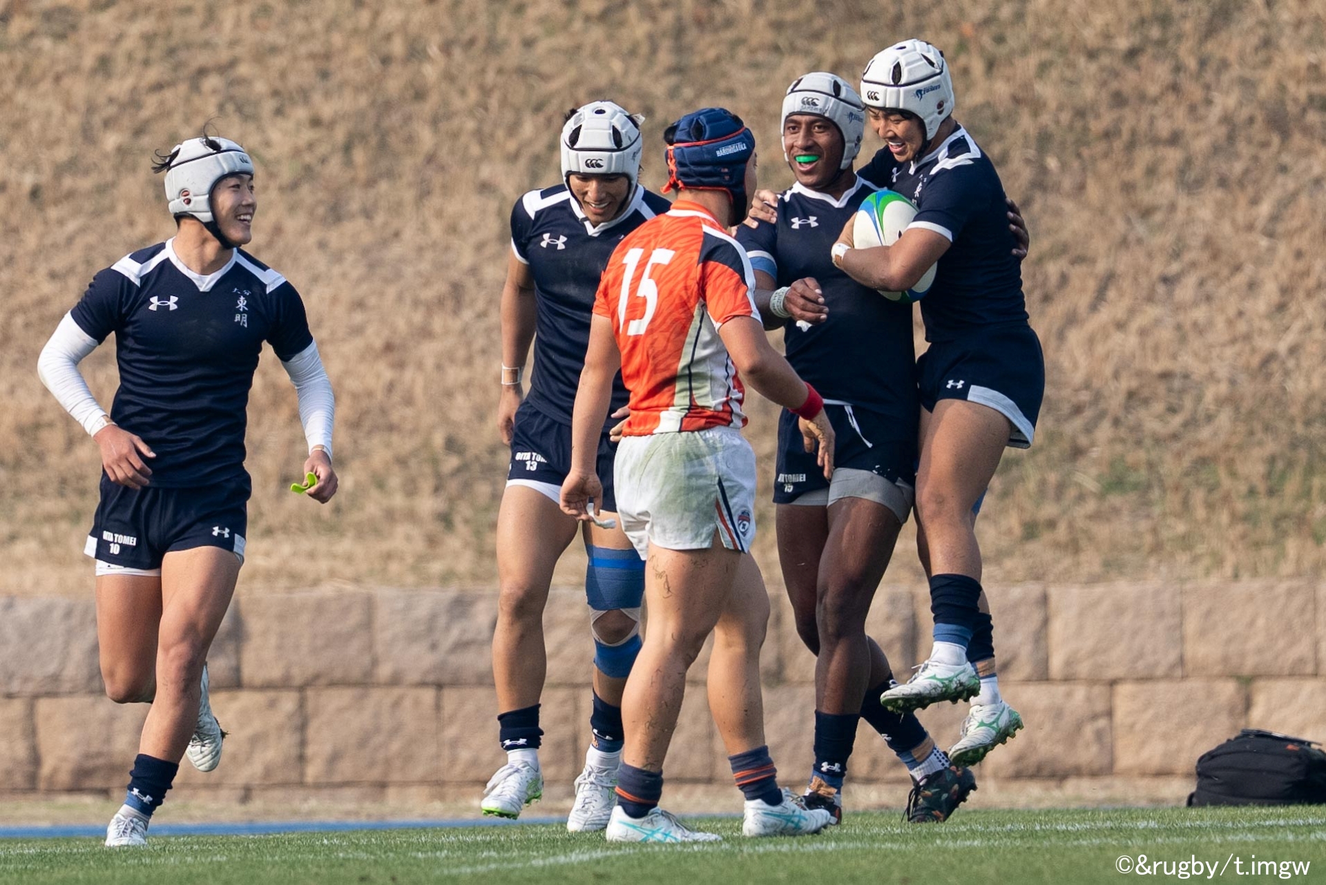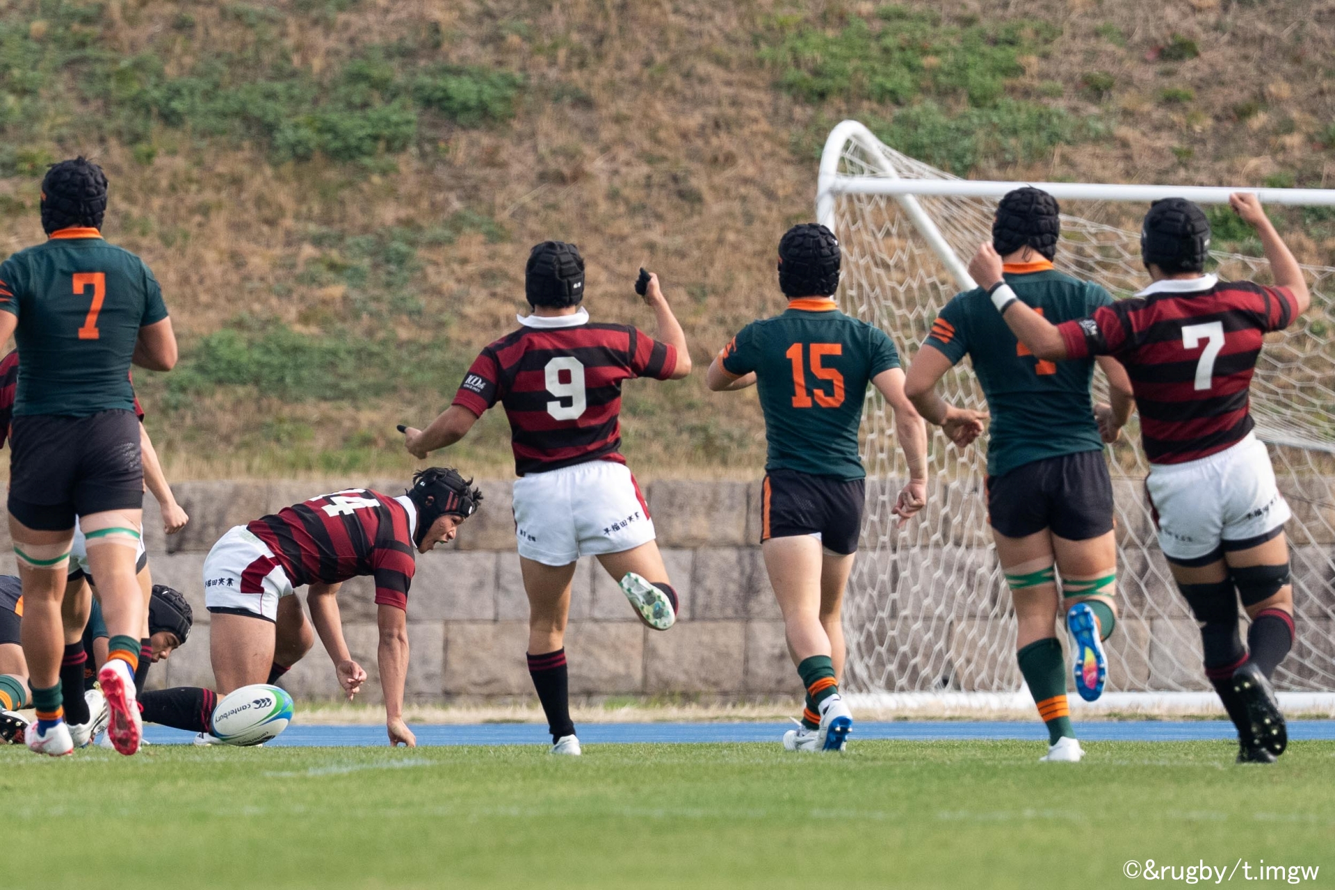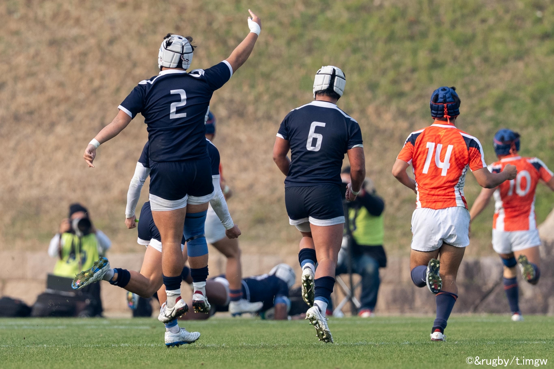 右サイドを崩して15番・加藤秀悟選手がトライ。さらに敵陣トライライン前のスクラムから、8番・坂口湊眞選手、9番・荒木奨陽キャプテンとショートサイドでつなぎ、最後は11番・秋本倖季選手がフィニッシュした。