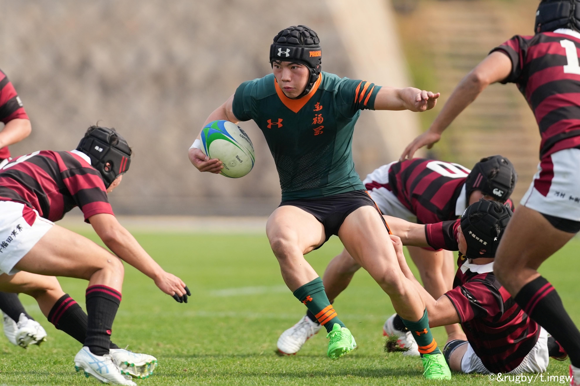 しかし前半終盤、東福岡が再び主導権を握る。左サイドを崩し、12番・半田悦翔選手が約30メートルを前進。サポートについた11番・礒部聖輝選手へとつなぎ、トライに結びつけた。