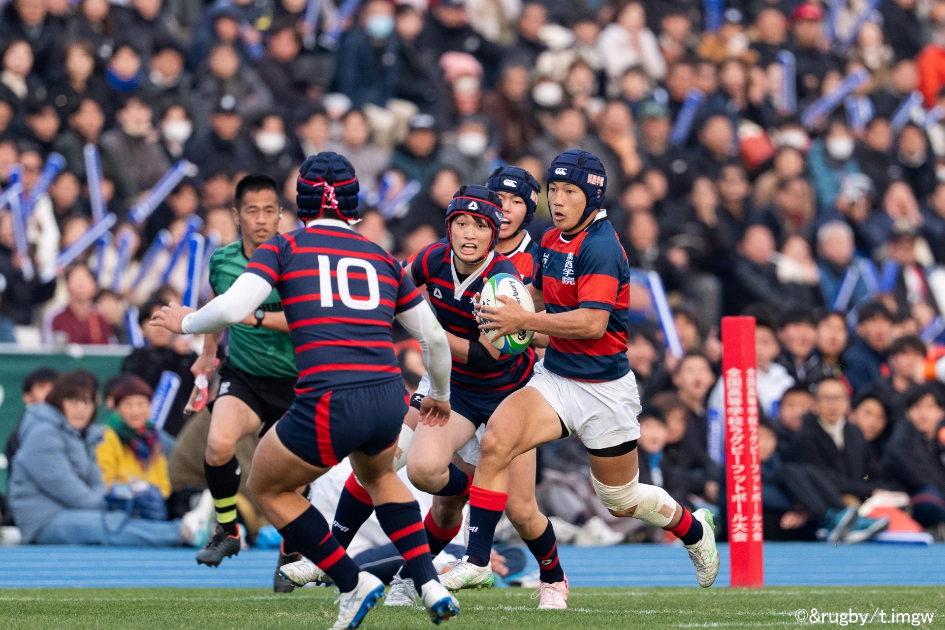 対する関西学院は、12番・西浦章博キャプテンが2本のペナルティゴールを沈めて逆転。さらに前半22分、トライライン前で粘り強くフェーズを重ね、1番・根木健太郎選手がグラウンディングした。