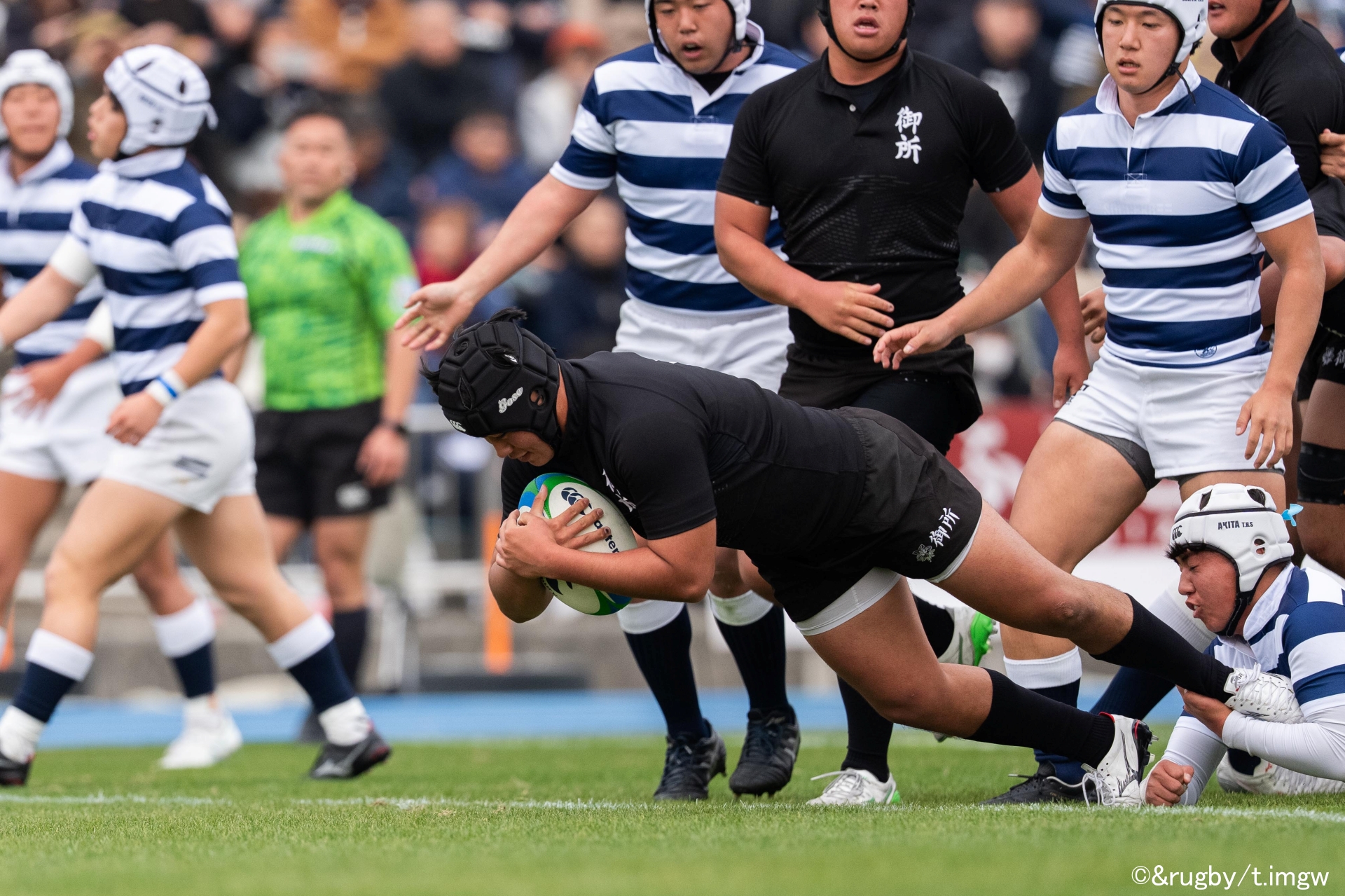 前半終盤、秋田工業にもチャンスは訪れたが、トライゾーンまであと数メートルの場面でターンオーバー。御所実業がボールを奪うと、そのまま独走トライへとつなげた。
