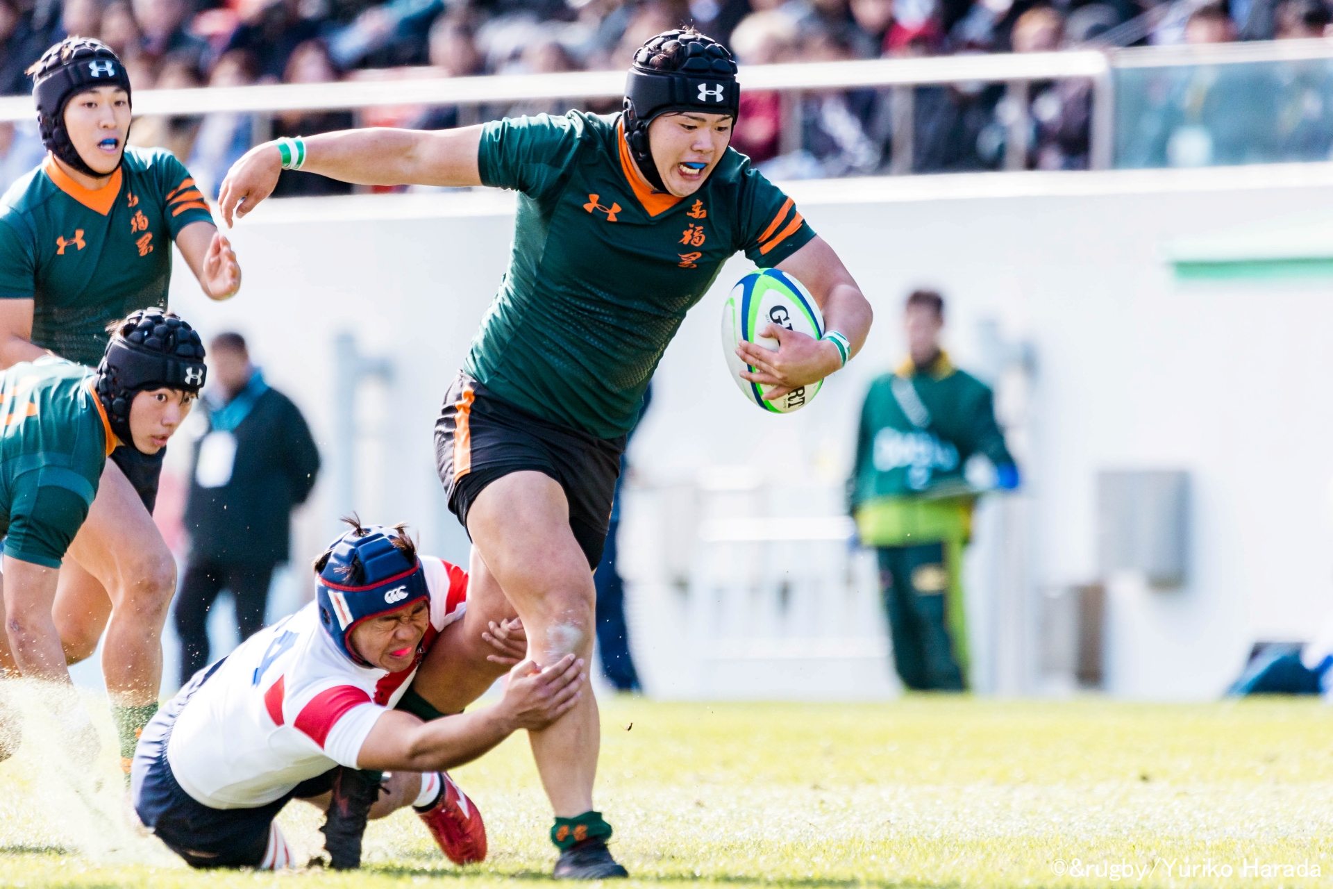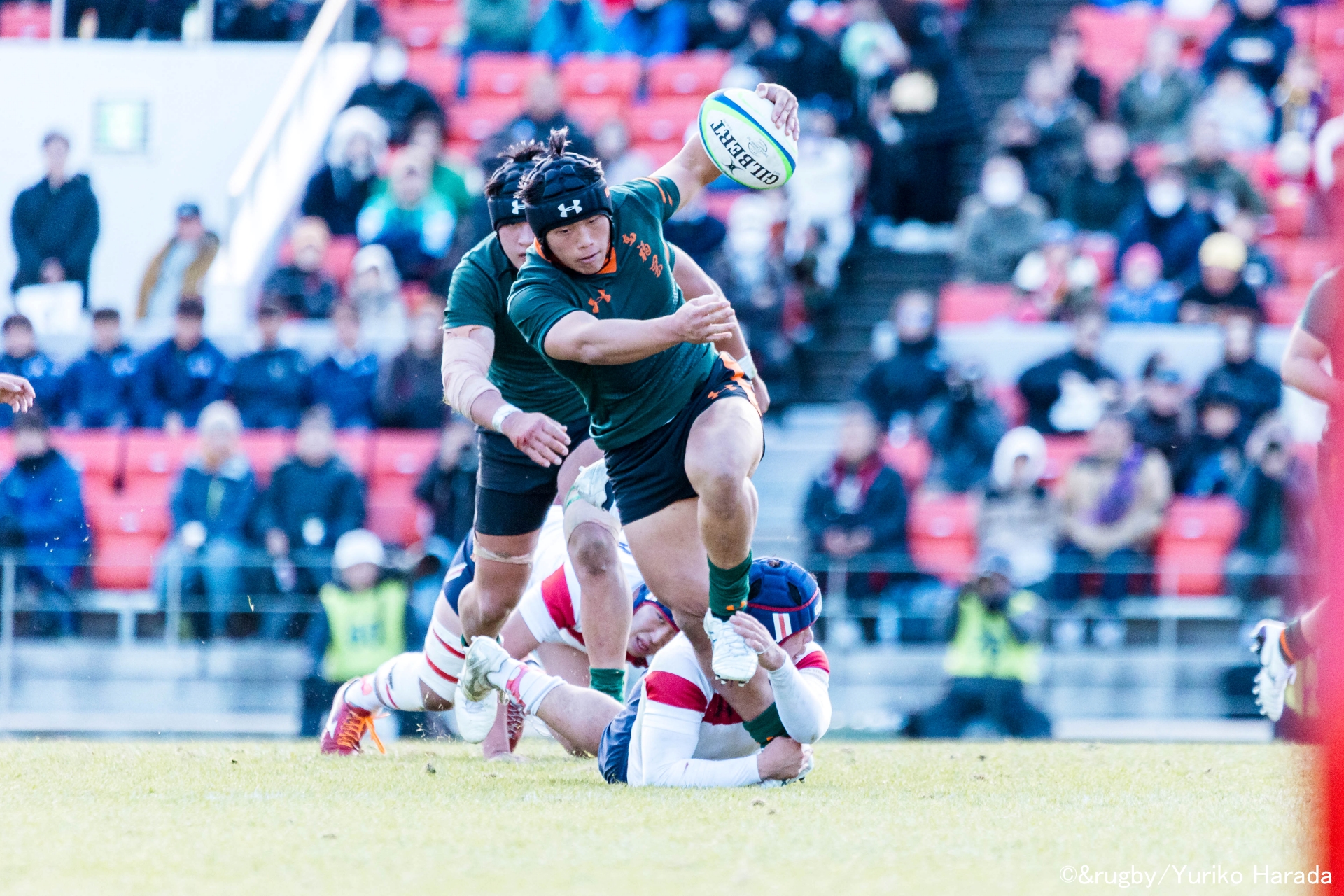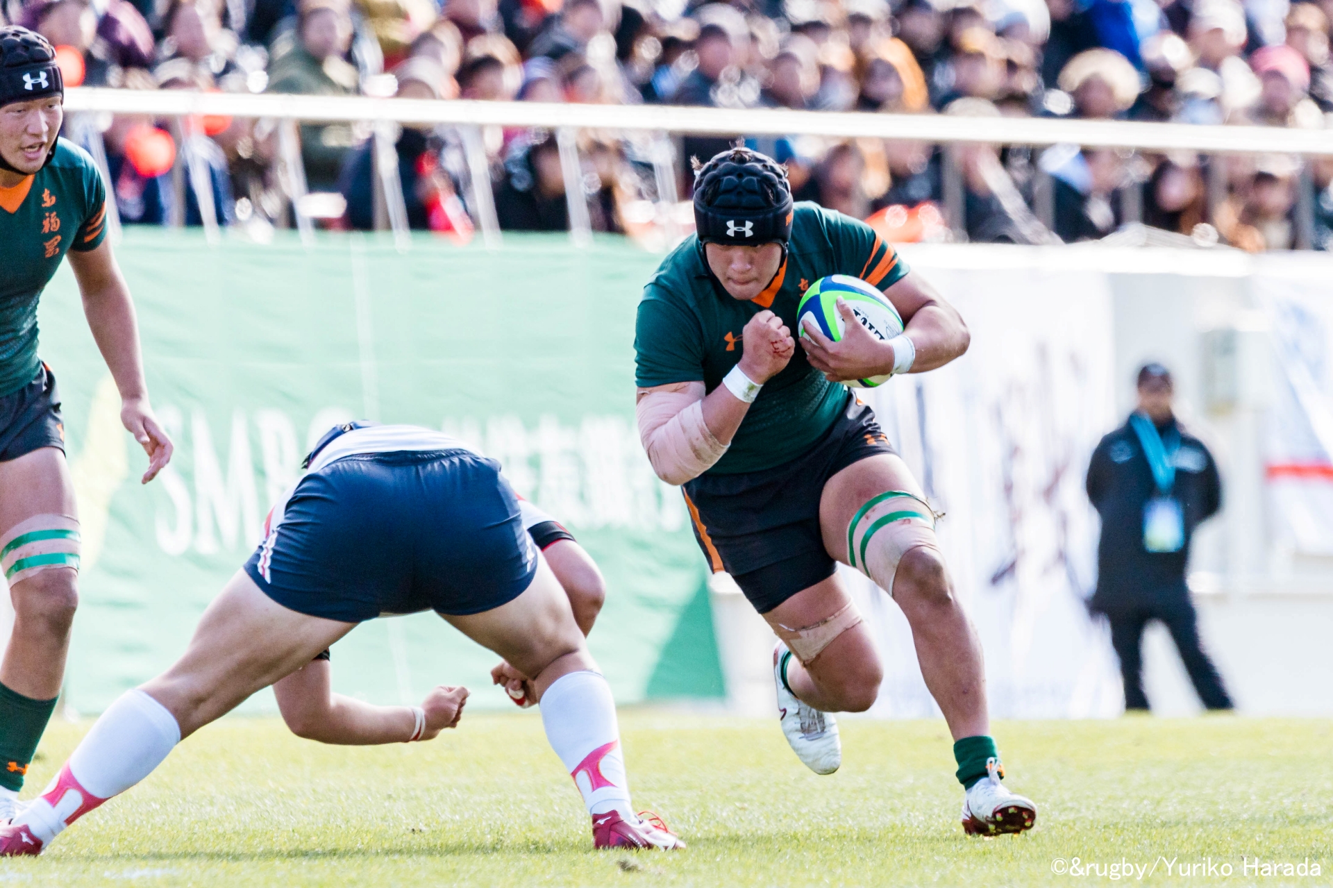 スティールが冴えたのは、花園3年目となった7番・古澤将太選手。8番・須藤蔣一キャプテンのボールキャリーは随一の突進力を見せた。