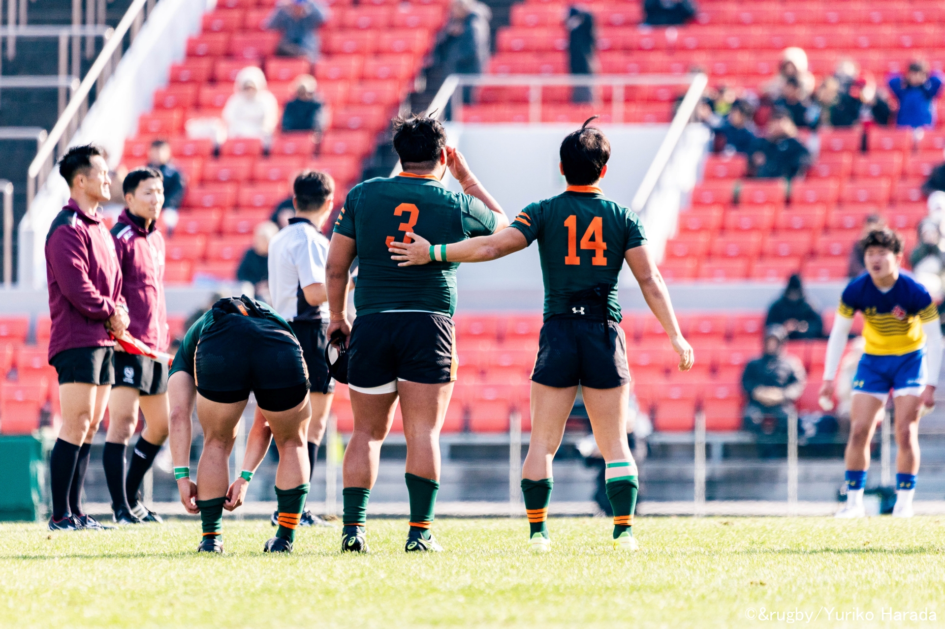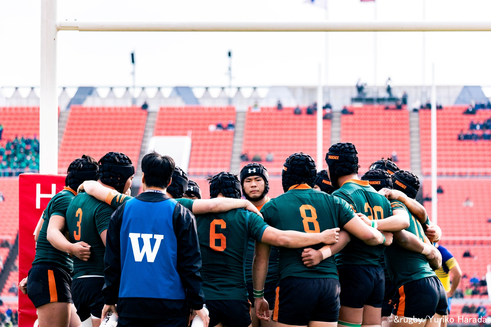 自陣トライゾーンで円陣を組んでいたバイスキャプテンの平尾龍太選手は、スコアボードを指さし、仲間に声を掛けた。