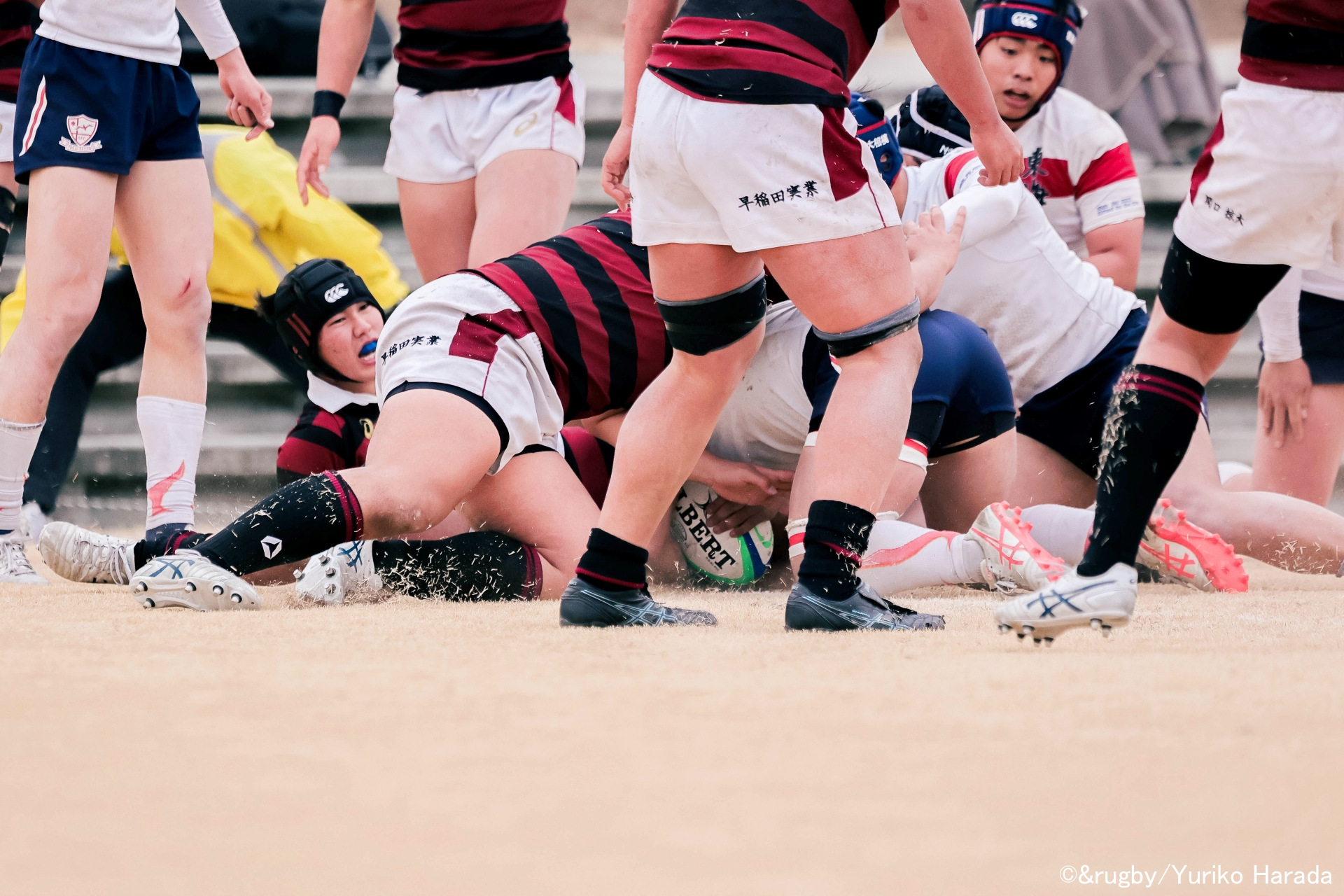 しかし早稲田実業は動じない。続くキックオフから一気に敵陣へ押し込み、テンポを落とさずフェーズを重ねる。後半19分、再び14番・飯泉選手がグラウンディングし、12-21と突き放した。